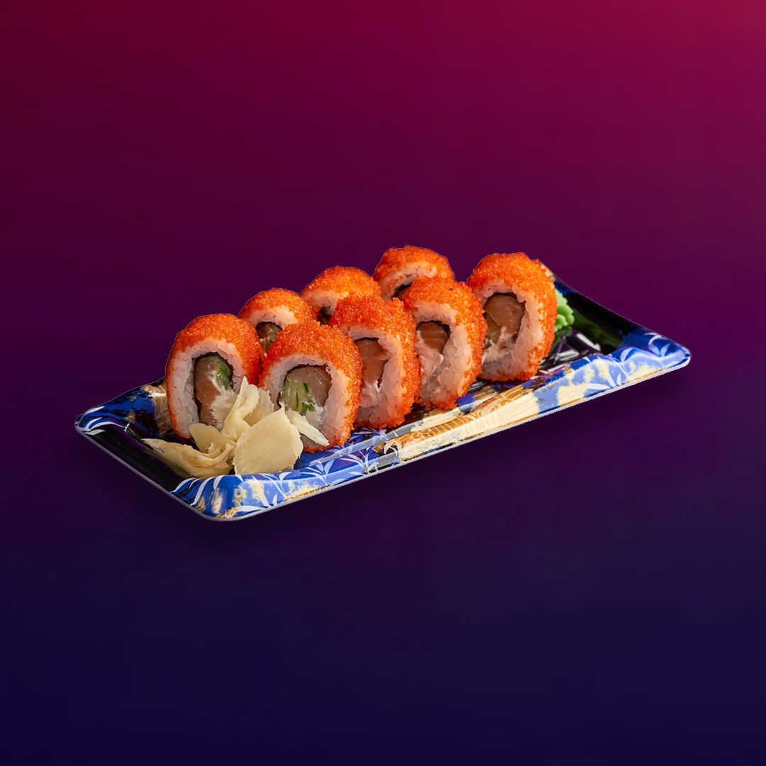 Рис, нори, лосось, сливочный сыр, огурец, икра тобико.