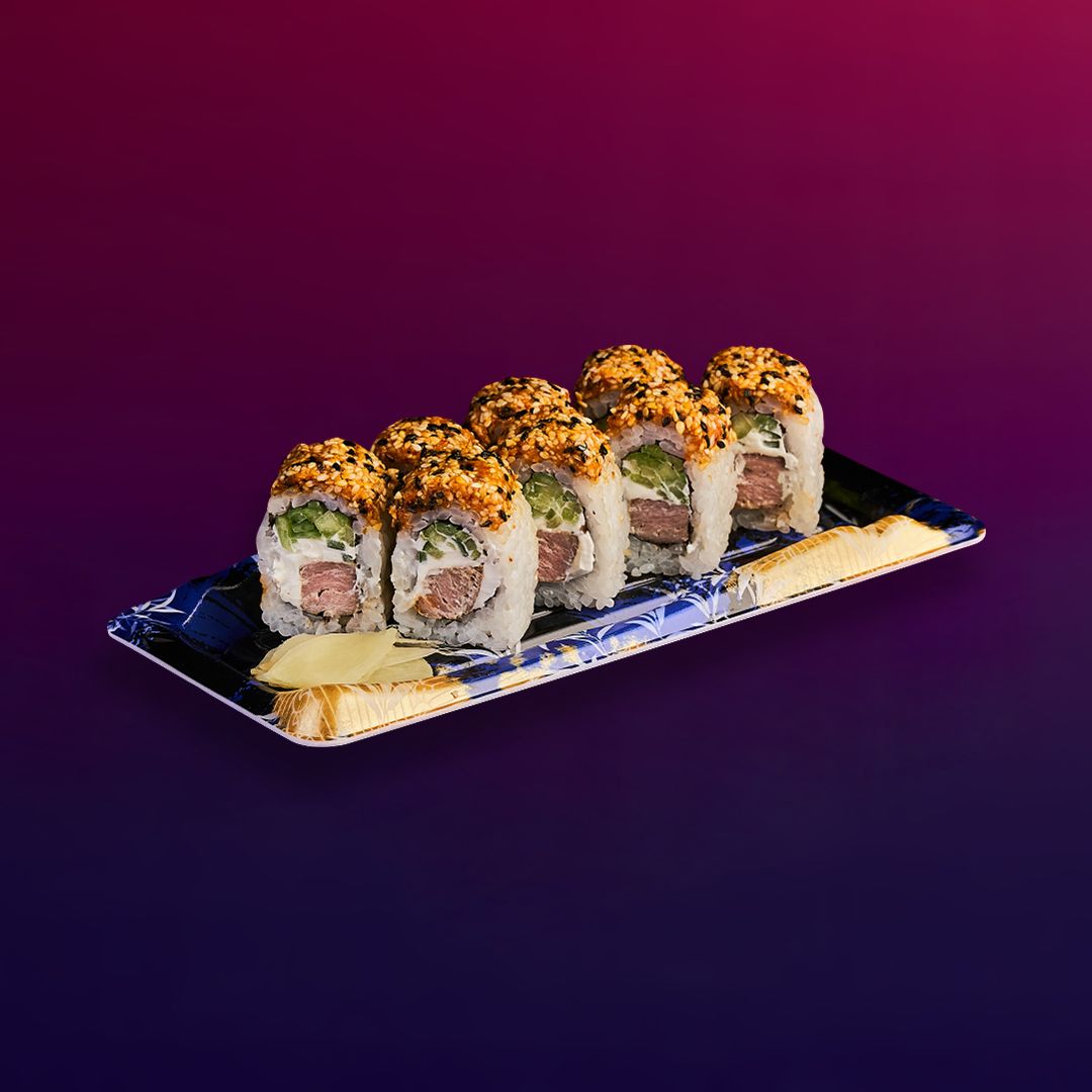 Рис, нори, сливочный сыр, огурец, тунец, приправа пряная, кунжут.