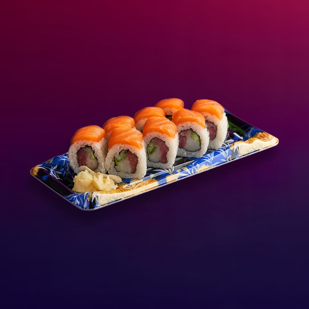 Рис, нори, сливочный сыр, огурец, гребешок, лосось.